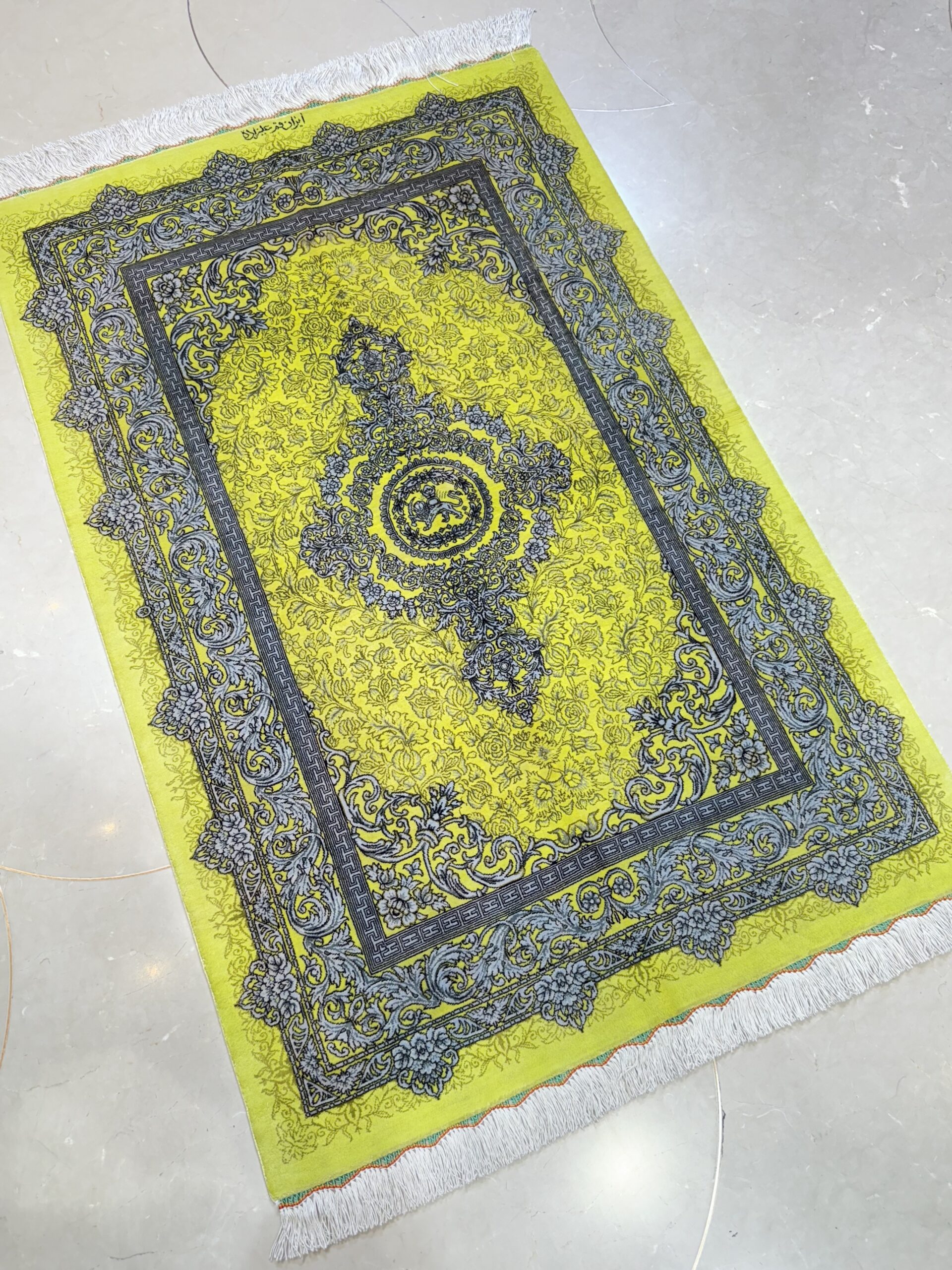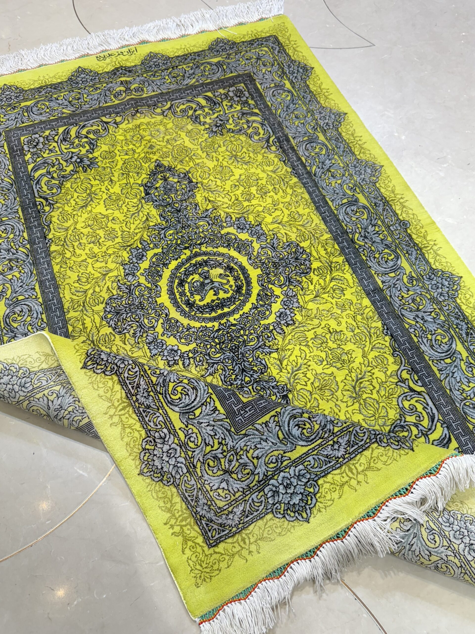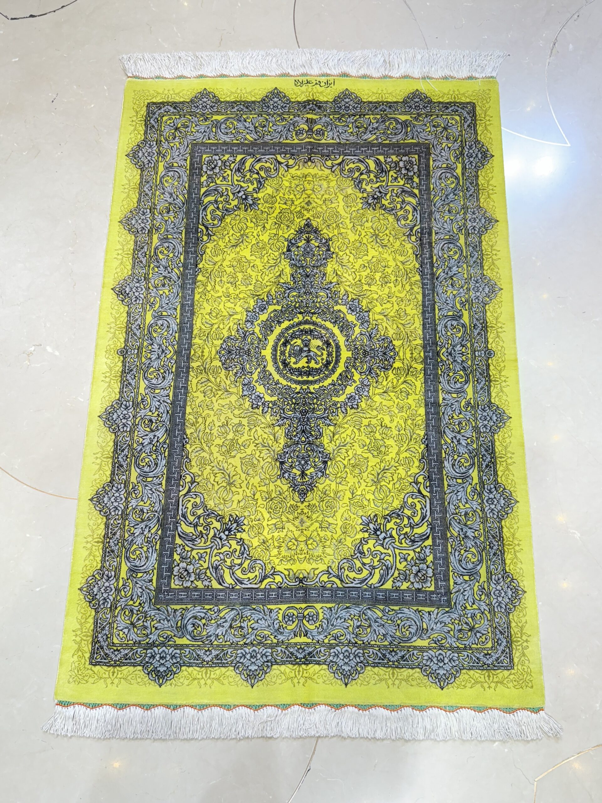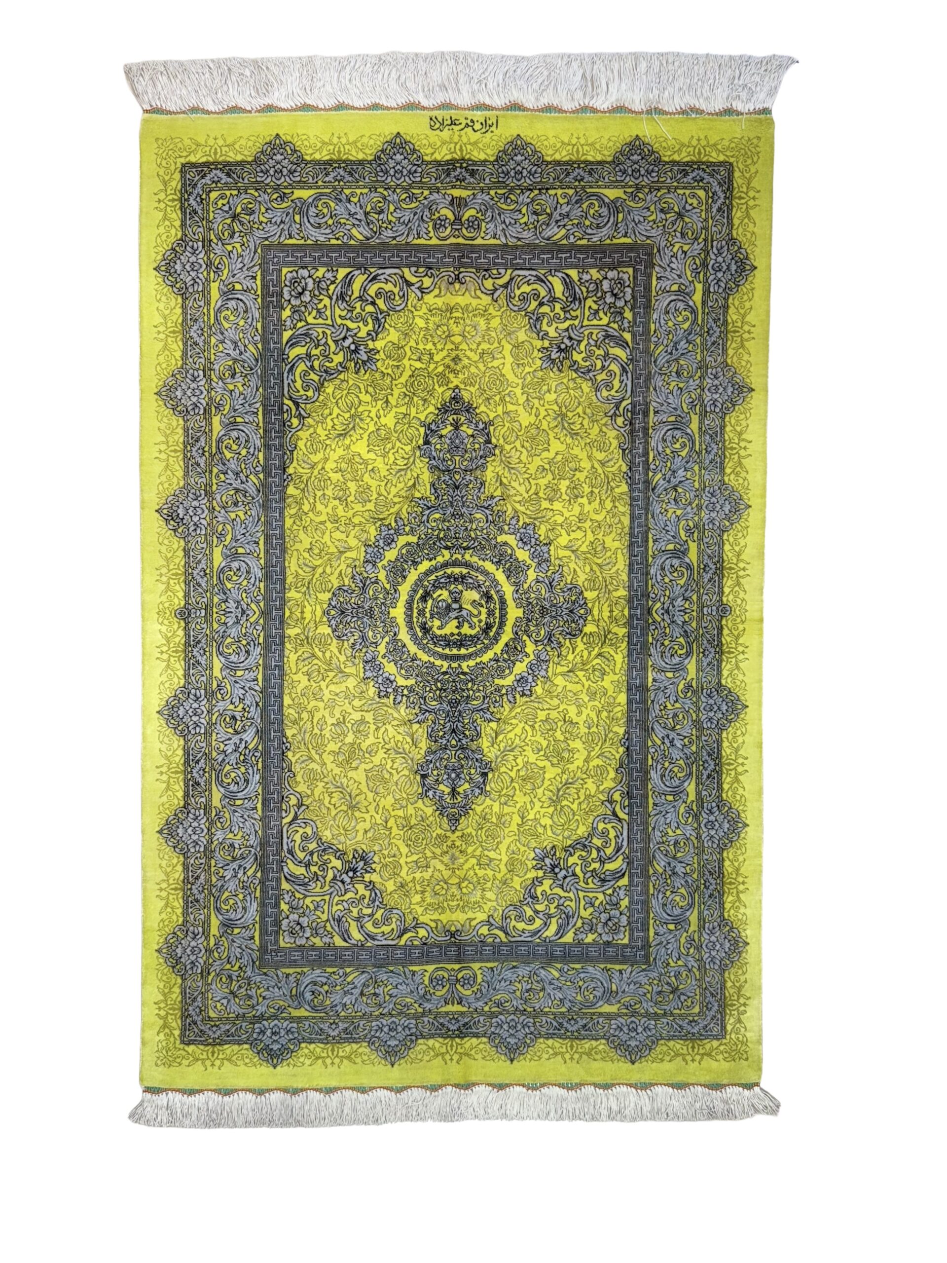 ذرع چارک تمام ابریشم قم برند علیزاده طرح شیر و خورشید با رنگ زرد و سبز و گل های سیلور