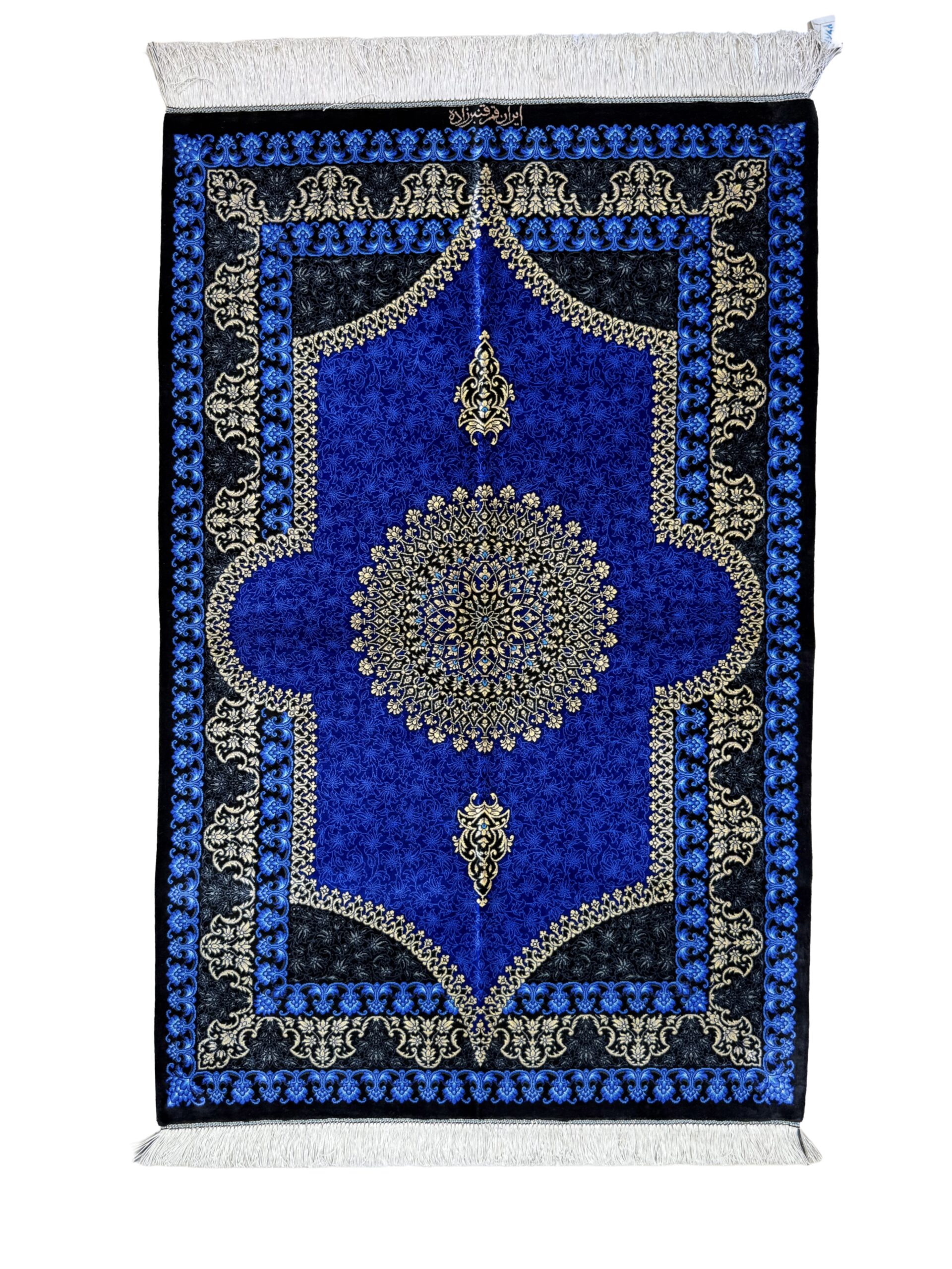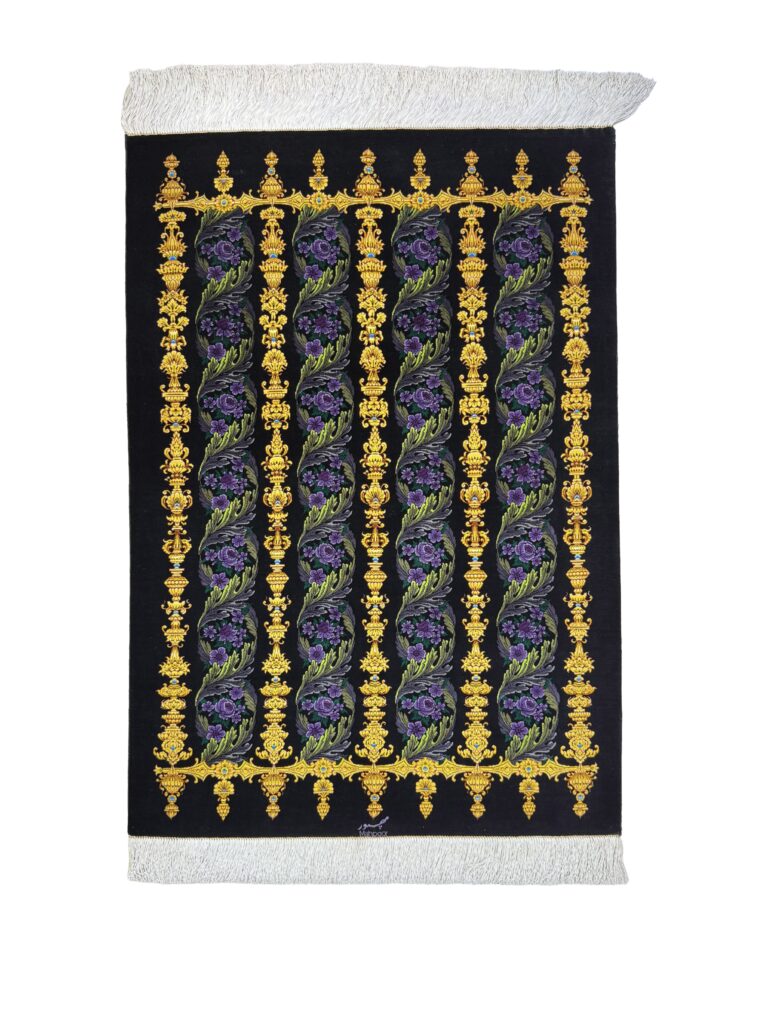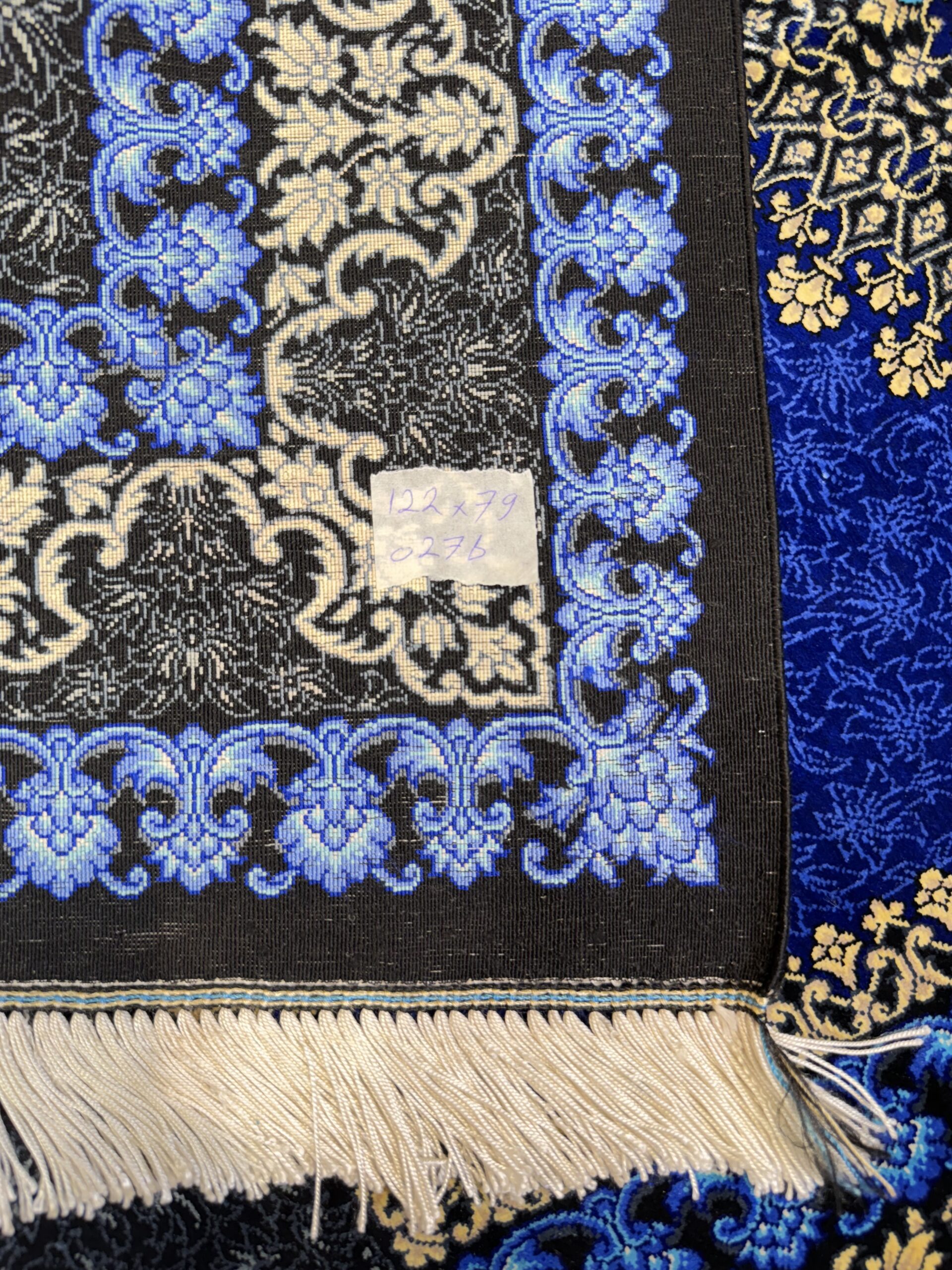 ذرع چارک تمام ابریشم قم سایز ۸۰ * ۱۲۰ سانتی متر ۸۰ رج با رنگبندی آبی مشکی طلایی برند قنبرزاده