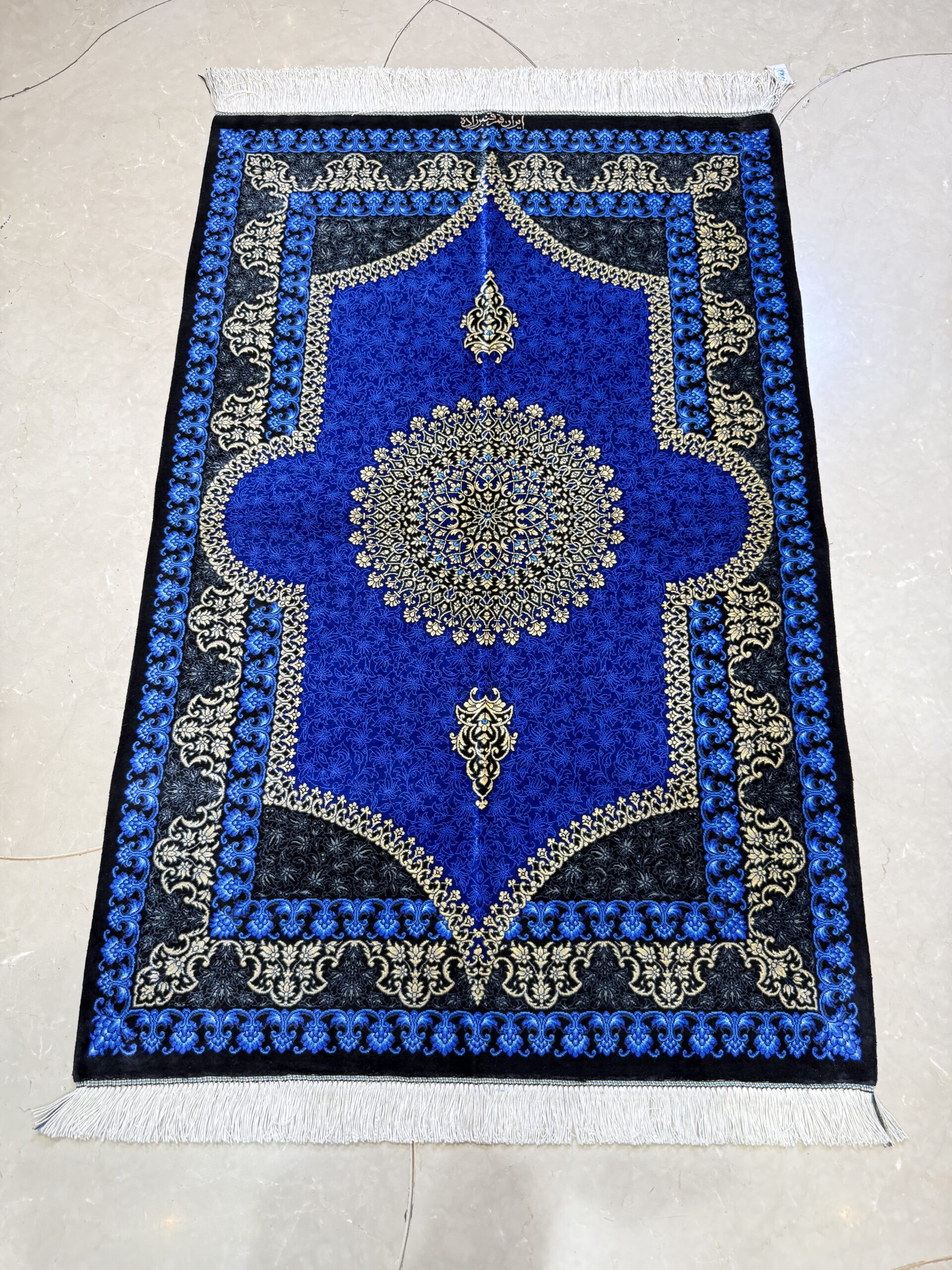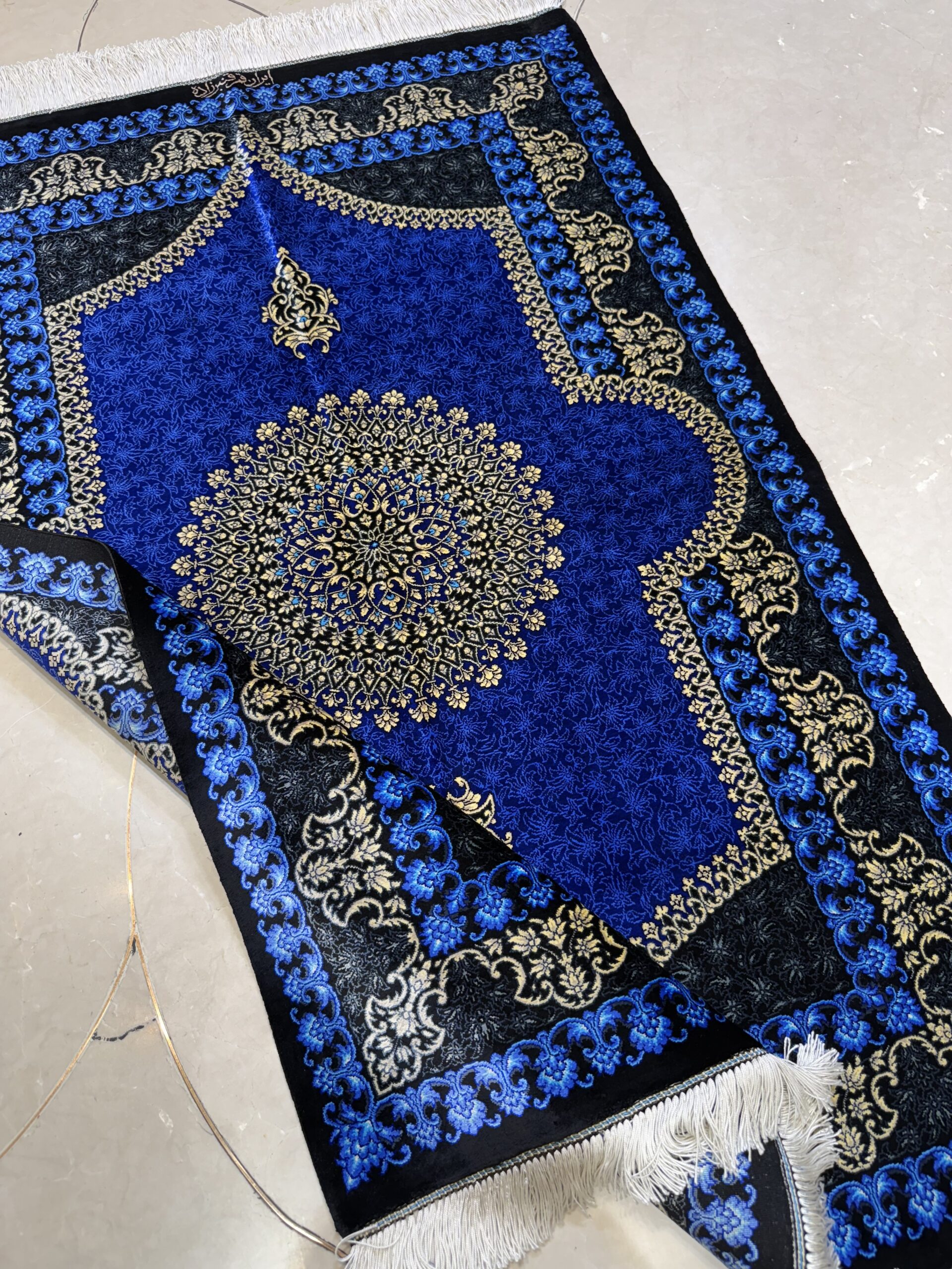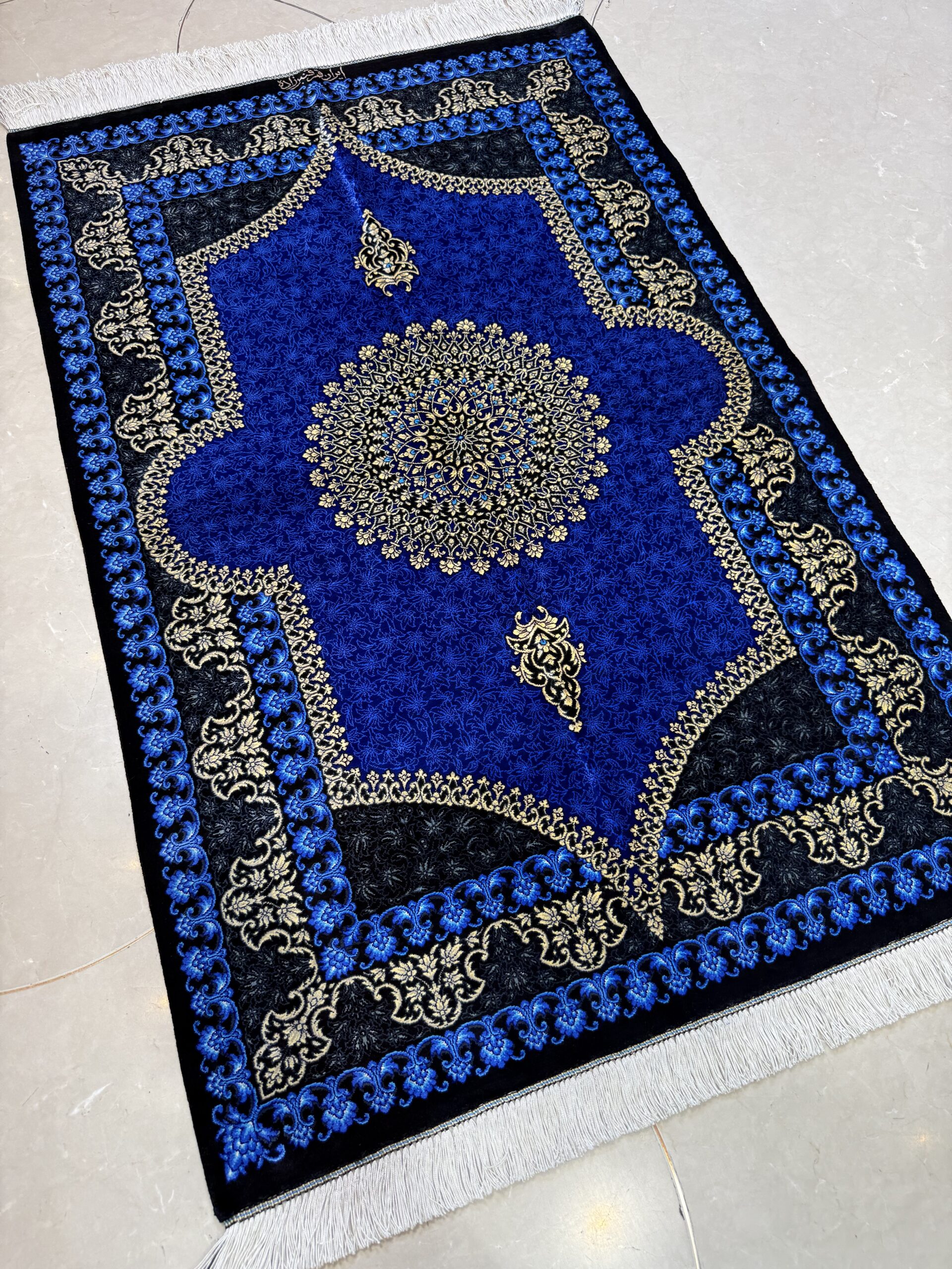 ذرع چارک تمام ابریشم قم سایز ۸۰ * ۱۲۰ سانتی متر ۸۰ رج با رنگبندی آبی مشکی طلایی برند قنبرزاده