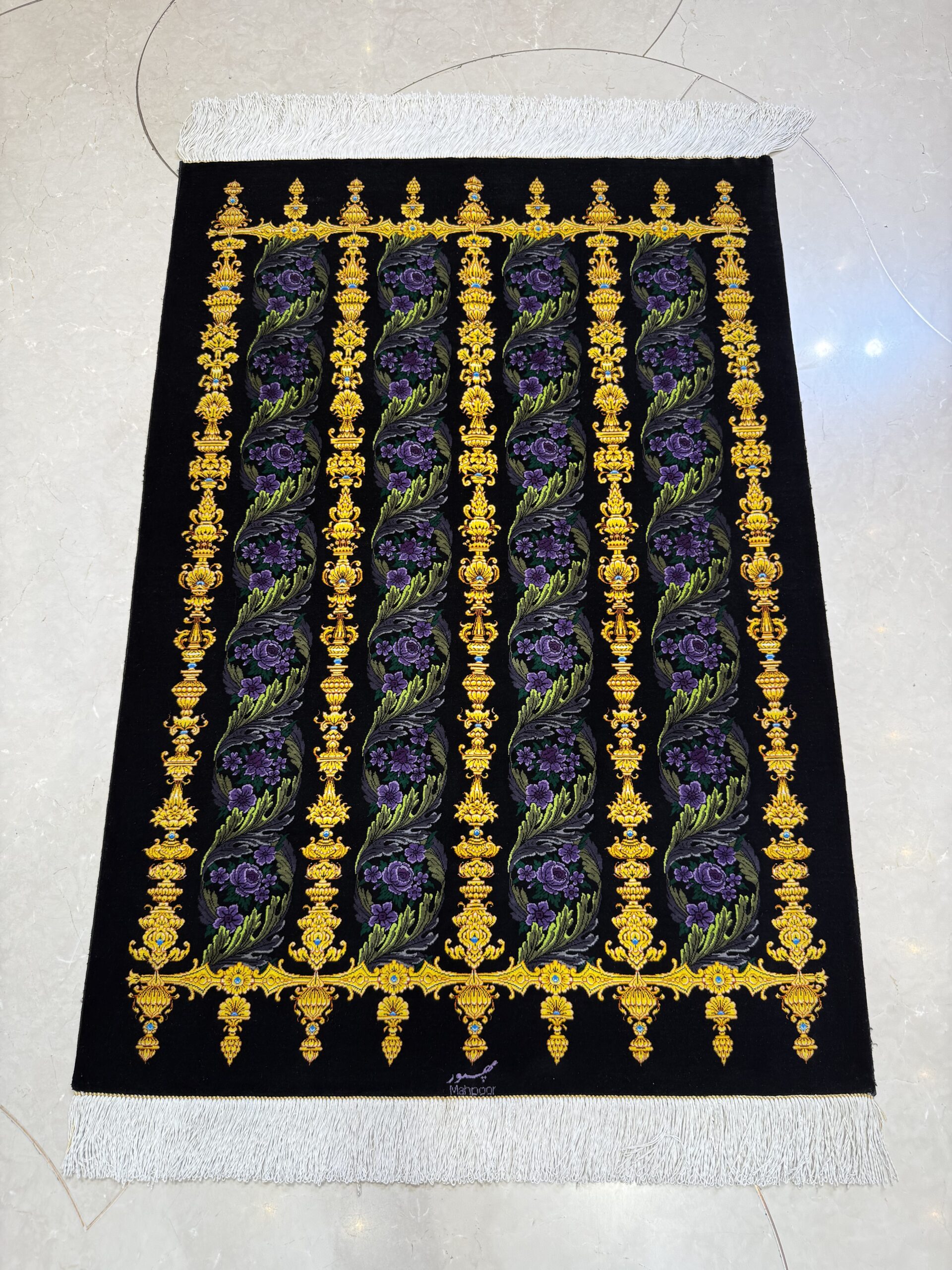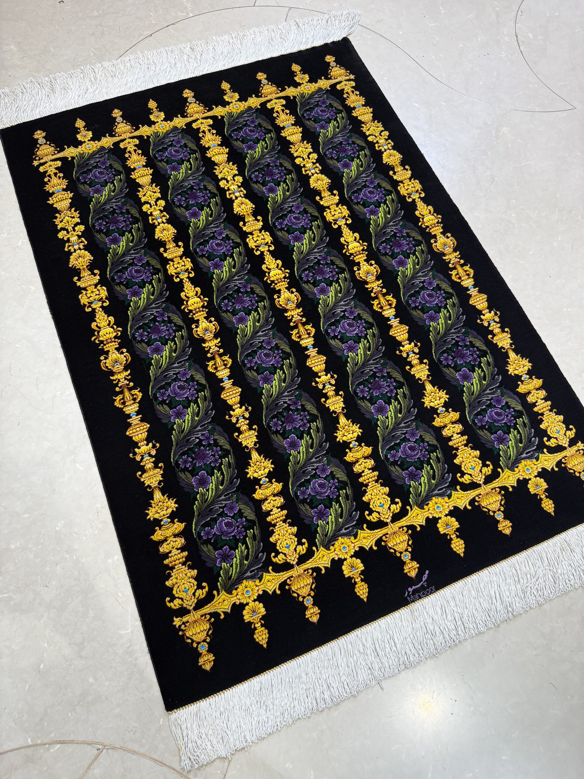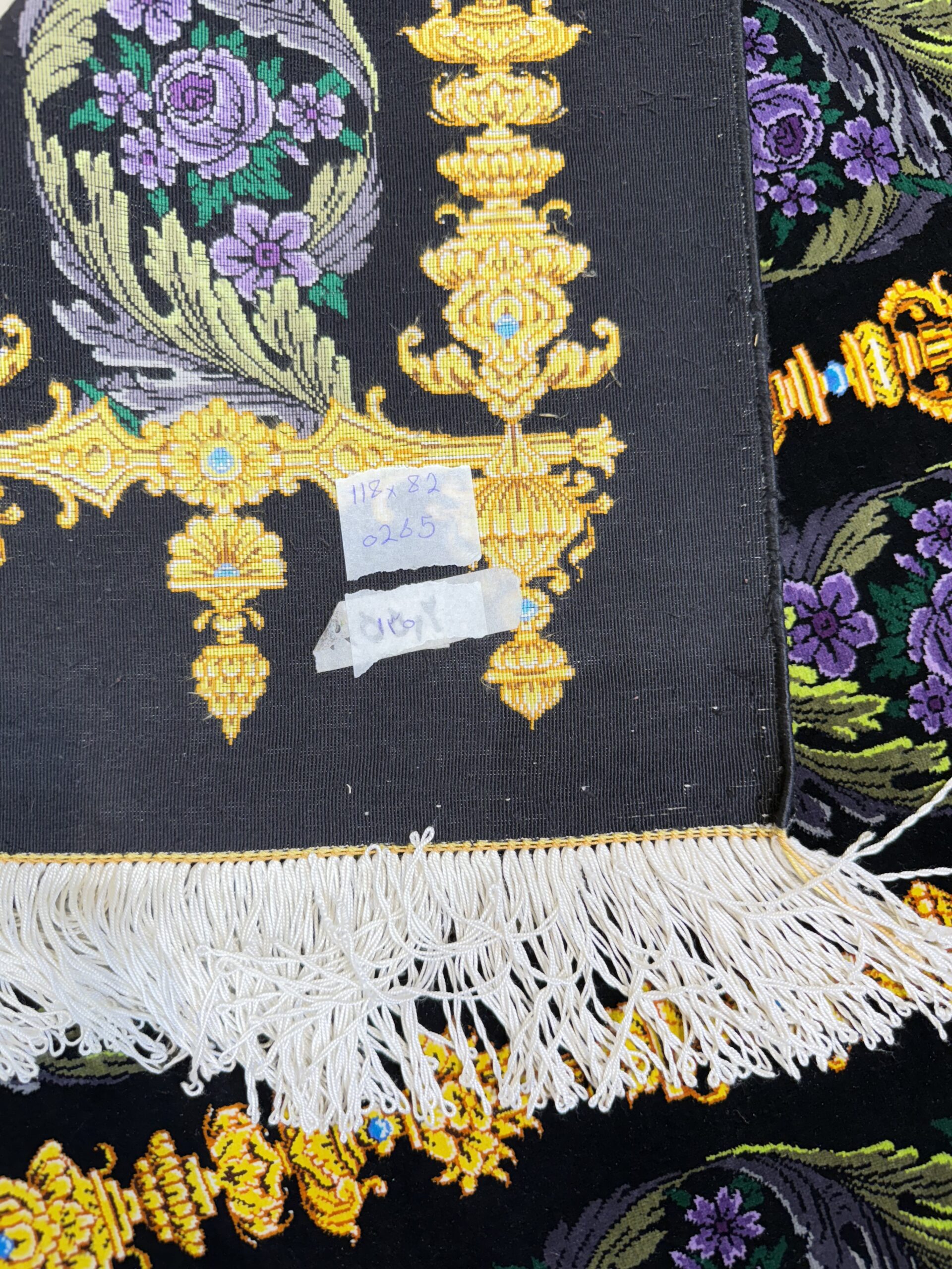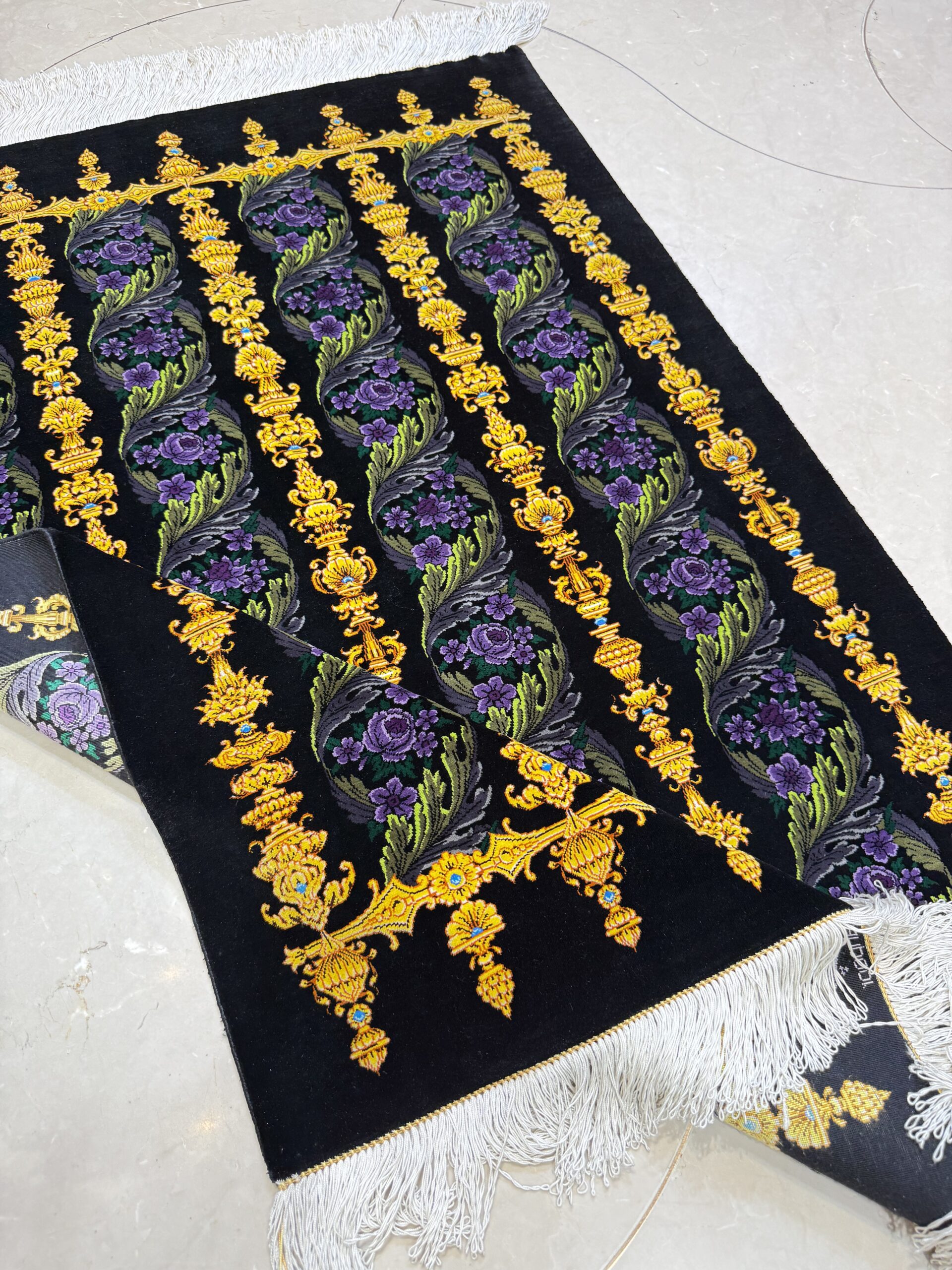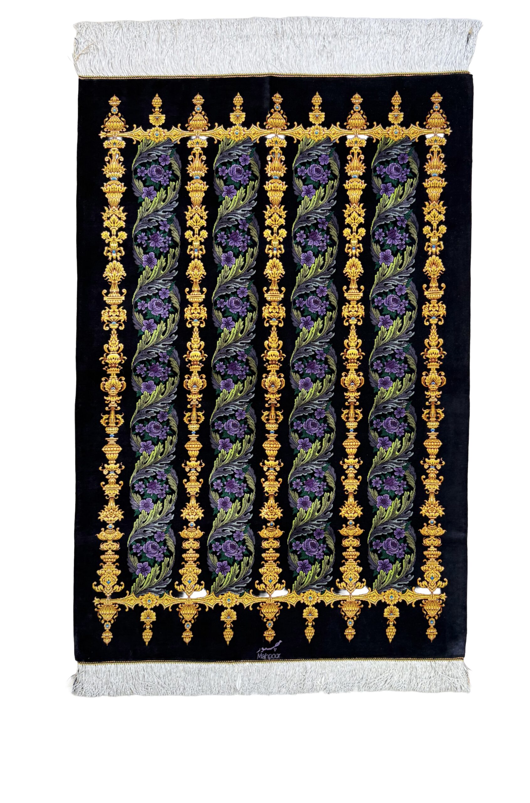 ذرع چارک تمام ابریشم قم برند مهپور طرح واگیره با رنگ بندی مشکی طلایی