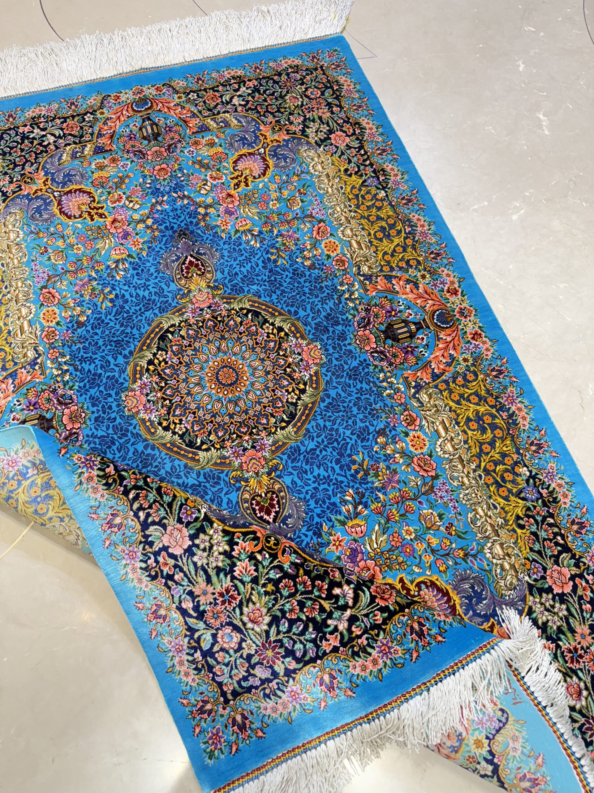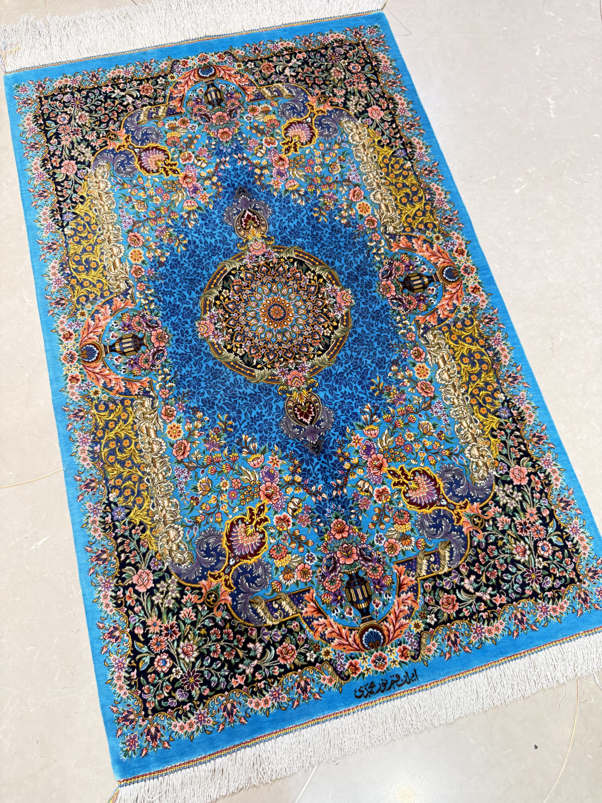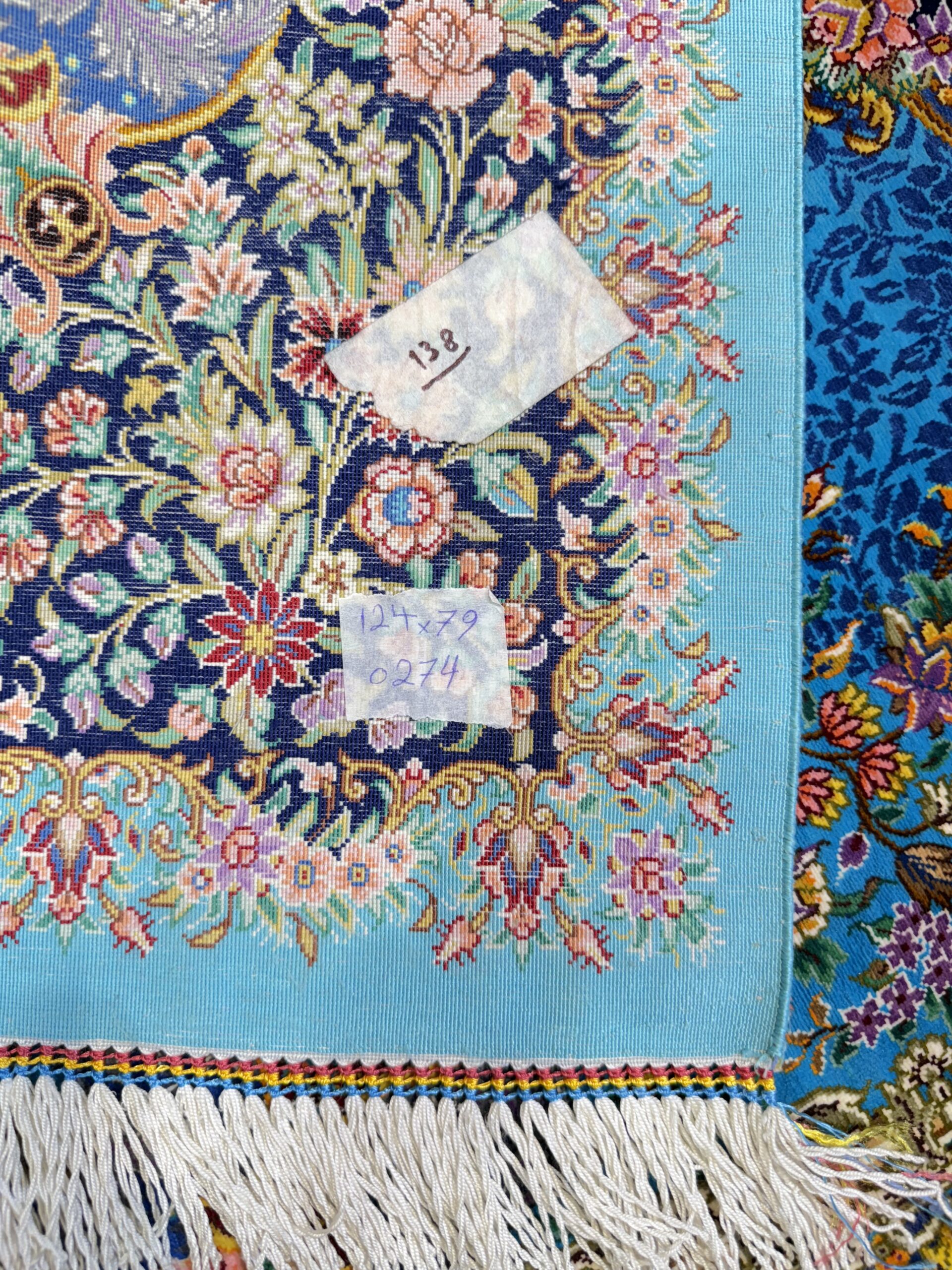 ذرع چارک تمام ابریشم قم برند نور محمدی سایز ۸۰ * ۱۲۰ با رنگبندی ابی فیروزه ای خاص و تک ۸۰ رج